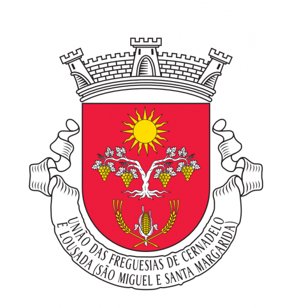 Escudo de vermelho, parreira arrancada de prata, folhada do mesmo e frutada com quatro cachos de uvas de ouro, dois em cada vara, acompanhada em chefe por um sol heráldico de ouro e em campanha por um feixe de duas espigas de trigo de ouro e uma de milho de ouro folhada de prata, unidas pelos pés. Coroa mural de prata de três torres aparentes. Listel de prata com a legenda a negro, em maiúsculas: “ UNIÃO DAS FREGUESIAS DE CERNADELO E LOUSADA (SÃO MIGUEL E SANTA MARGARIDA) “.
